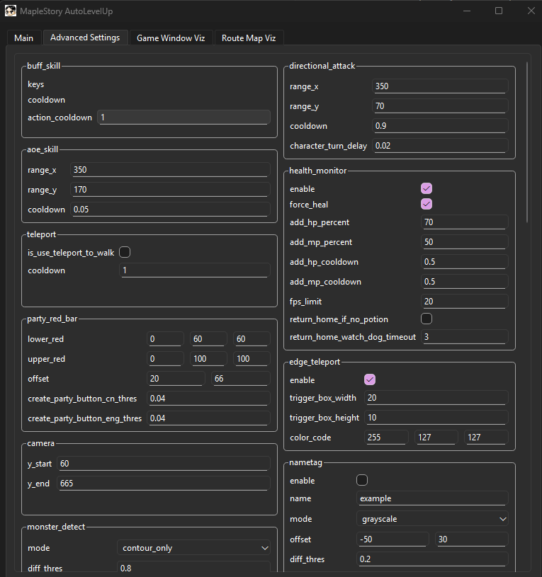 Visualization Tabs – Real-time windows for game capture preview, mob detection overlays, and route-following debug views.