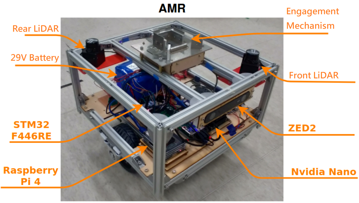 Our individual Autonomous Mobile Robot (AMR) is outfitted with two 2D Lidars, one positioned at the front and the other at the rear. It also features a ZED 2 2D stereo camera at the front. The computational platform includes an NVIDIA Nano, tasked with image processing, and a Raspberry Pi 4 for handling all other algorithms. The AMR is powered by two brushed motors with encoders, providing precise wheel movement information. It operates on a 29-volt battery, enabling continuous operation for approximately 30 minutes. Additionally, the AMR is equipped with an engagement mechanism on top, utilized for attaching and dettaching to loads shelf.