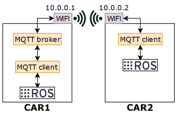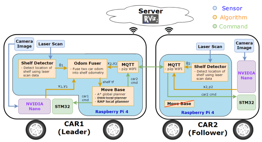 Communication between the two AMRs is facilitated by MQTT and Wi-Fi. For navigation, we moved away from the standard DWA local planner and developed our own custom RAP local planner, tailored to this unique configuration. Notably, the follower AMR no longer requires its own navigation algorithm; it simply responds to the commands transmitted from the leader, controlling its motors accordingly.