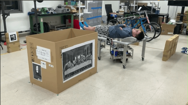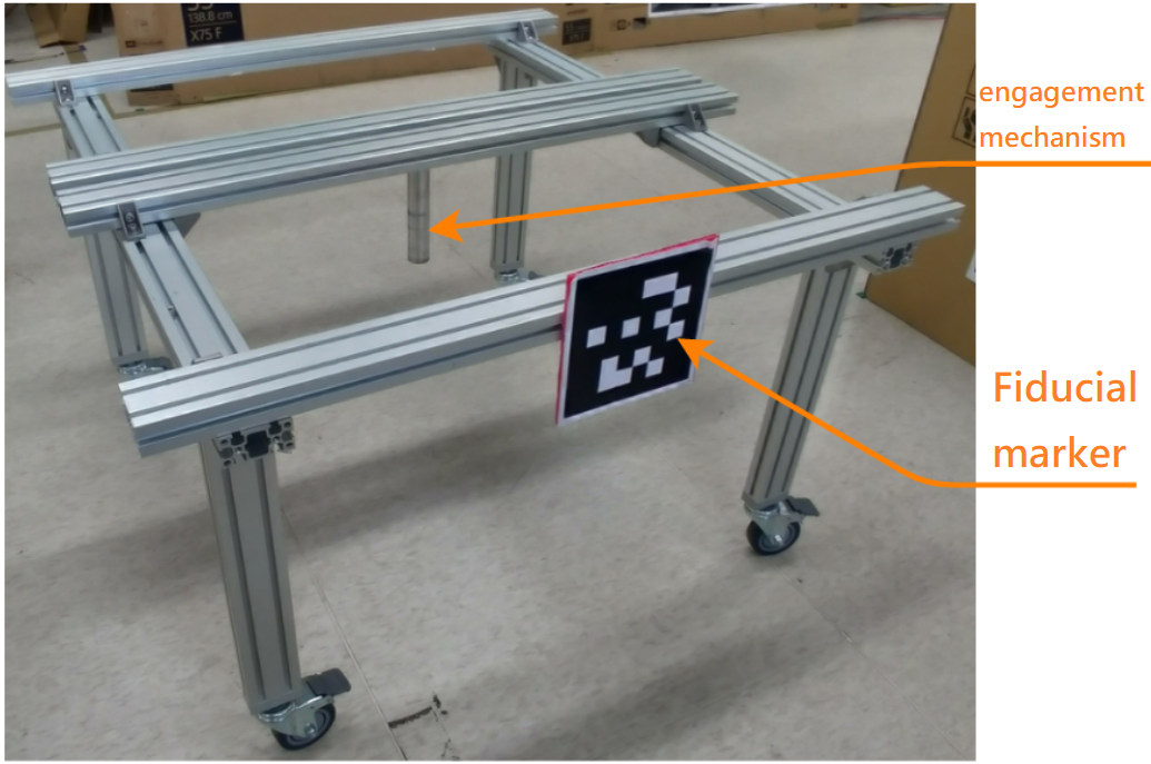 Our loading platform is constructed using sturdy aluminum structures. At the center of the shelf, there is an engagement pin designed to engage with one of the AMRs. The front of the shelf is pasted with fiducial marker, which is essential for recognizing and localizing the shelf during the AMR’s operation.