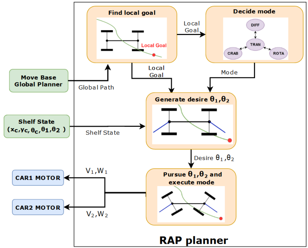 The RAP planner takes the path generated by the Move Base Global Planner as its input. Its first task is to identify a feasible pursuit goal located on the static global path. The planner’s primary objective is to pursue this local goal. It begins by determining which navigation mode to use to effectively reach the local goal. Following this, the planner calculates the desired bearing angles, Theta 1 and Theta 2, corresponding to AMR 1 and AMR 2 respectively.