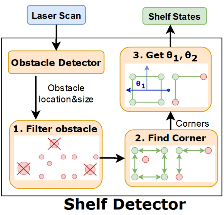 To detect load shelf, we develop an corner detector based by Lidar data. We employ an out-of-the-box object detector; and than, we filter out obstacles that are either too small or too large. Subsequently, we identify potential shaft candidates by examining the geometry of objects.