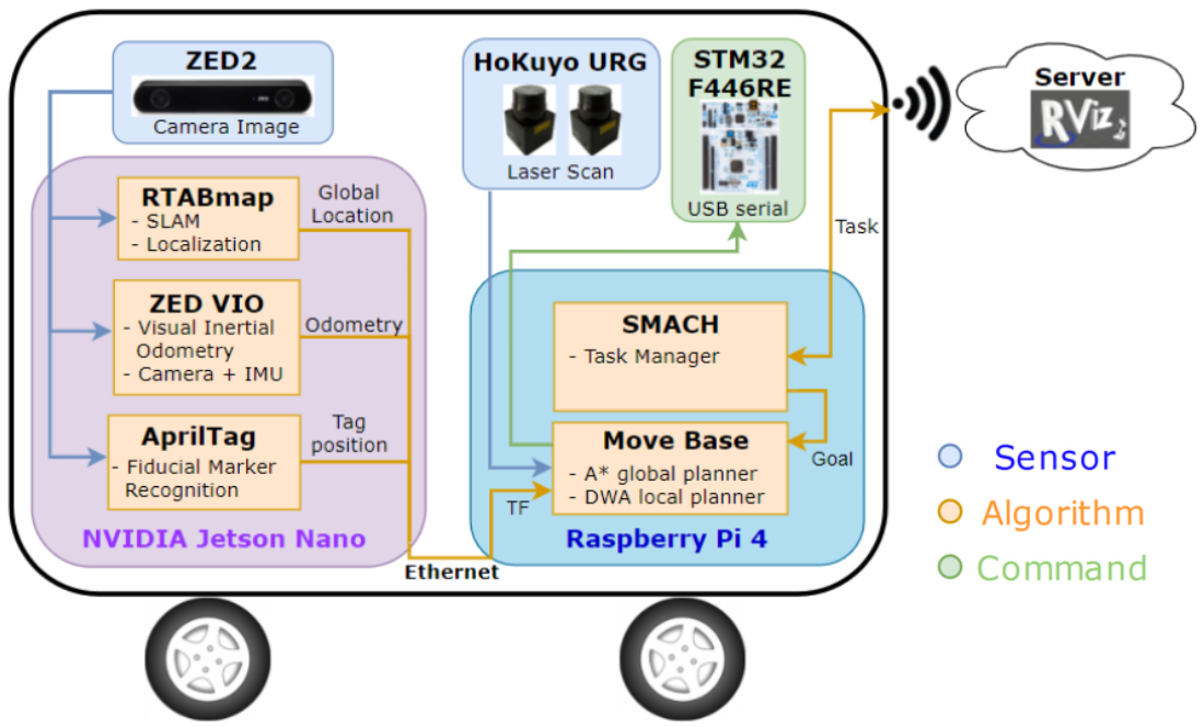 Our software architecture is structured as follows: The Nvidia Jetson Nano is tasked with processing the dual camera images. We use RTABMAP as our visual-based SLAM algorithm to build maps while the robot scans the environment. Additionally, we leverage the ZED camera’s built-in visual-inertial odometry for accurate estimations of the robot’s kinematic information. To recongize load shelf, we use AprilTags (fiducial markers).