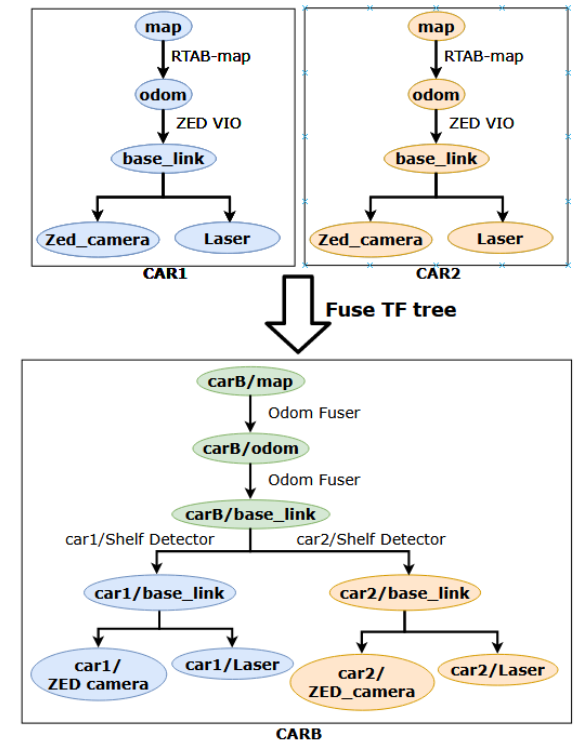 When two Autonomous Mobile Robots (AMRs) are combined to transport a load towards a common goal, significant software modifications are required. In our non-homogeneous multi-robot system, one AMR is designated as the ‘leader’, while the other acts as the ‘follower’. The leader AMR is responsible for receiving sensor data from the follower and must consolidate this information to calculate navigation commands for both vehicles, ensuring safety and seamless cooperation. In this setup, the leader AMR functions as the front wheels, while the follower AMR acts as the rear wheels.